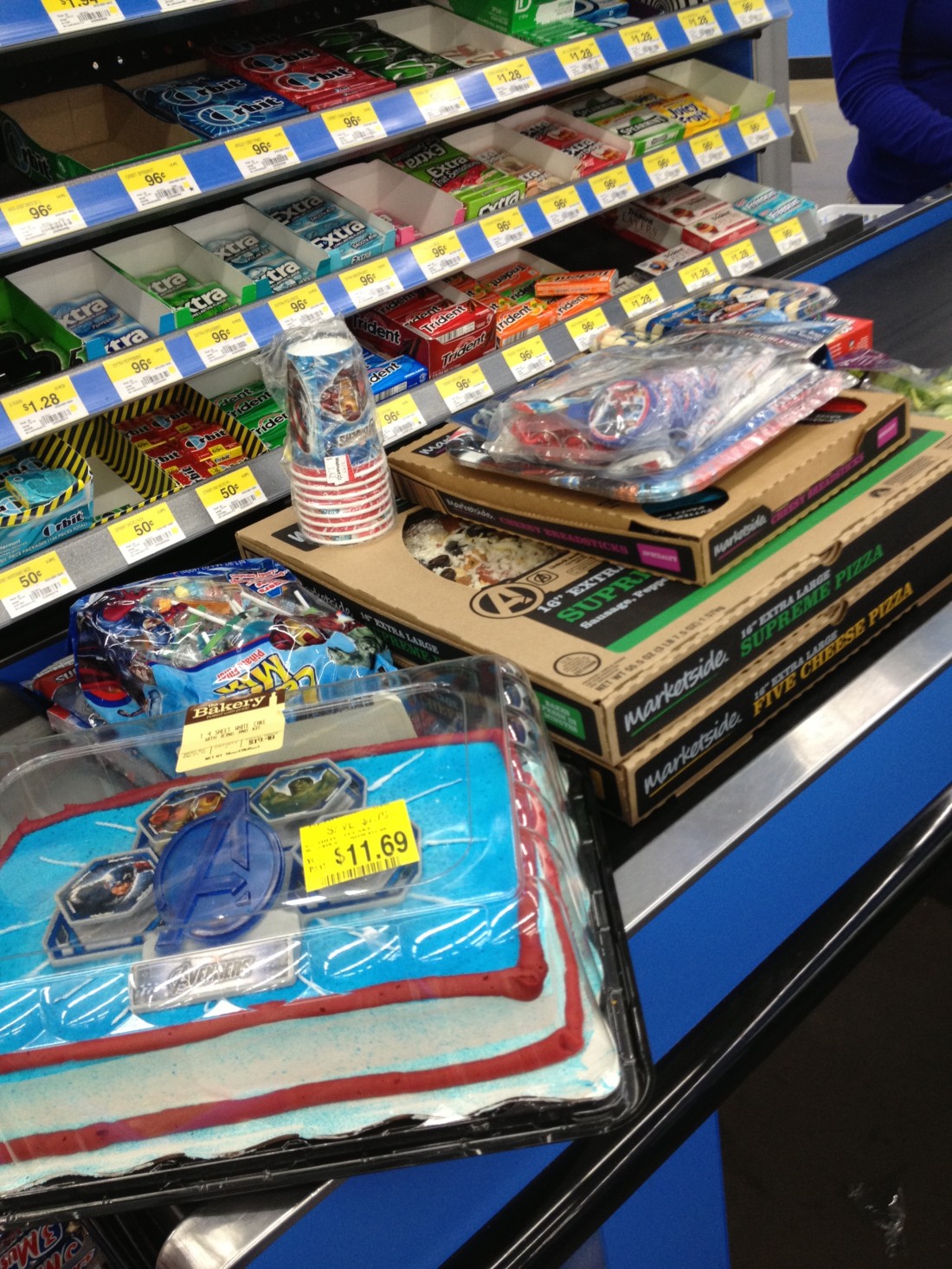 After finding all our foods, we were really excited with all the party supplies WalMart stocked specifically themed for The Avengers too. And with so much to choose from our items were piled high on the conveyor as we checked out. We had found great selections for the in-house Marketside brand ready-made salad, pizzas, and cheesy bread. And did I mention we got a great deal from the Bakery section on The Avengers sheet cake? It was the last one left and nearly half the original price. I love the deals you can get at WalMart!