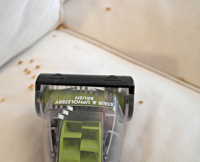 One attachment feature I really found useful on the Eureka AirSpeed One Turbo vacuum right away? The onboard stair and upholstery brush. Check out that rotating bristle handiness right there! How lucky was I that the kids decided to take their granola snack to eat on the couch? This pulled up all the visible cereal and then I used the crevice nozzle to get in-between the cushions.