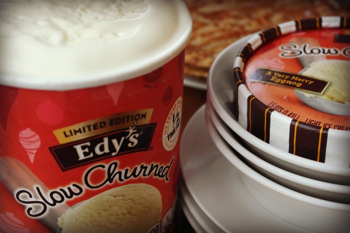 After all this great food, make sure to save room for dessert! Keep that freezer feeling important, and turn to the slow churned light Edy’s ice cream. Now…while I love the taste of Eggnog, drinking the real thing just gives me the heebie-jeebies. But you will find me first in line to get the new limited edition Very Merry Eggnog ice cream from Edy’s that is in stores right now. {Its simply spiced Christmas yumminess!} My favorite way to serve it is a-la-mode with scoop over a warmed caramel apple pie.