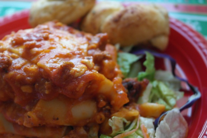 This year saw us taking our Lasagna with Meat Sauce on the road. The first year in many to celebrate Christmas with my in-laws, we wanted to concentrate on the aspect of being together finally…not being in the kitchen all day. With cooking times in both a frozen and thawed state, you can serve up a great entree in less then 1-2 hours. No muss – no fuss- and all flavor; I paired ours up with a premixed salad and garlic bread knots. And really, nothing says holiday buffet like piling your entree on top of the salad to make more room on that plate!