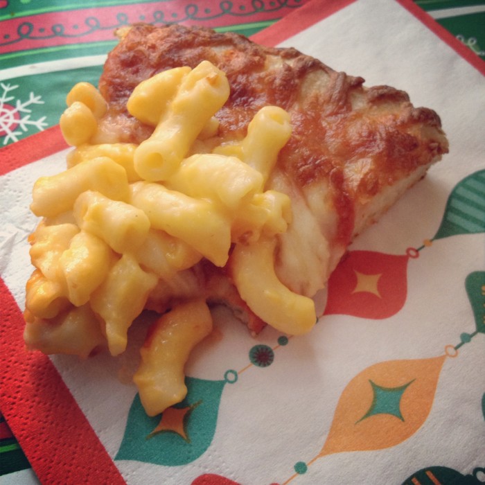 On the event we also bake up the Stouffer’s Macaroni and Cheese two favorites get even better! After the pizza has been baked in the oven as directed, take it out and immediately top the cheese half with the Stouffer’s mac-n-cheese. Then as the pizza takes 5 minutes to cool and settle, the newly added pasta will gently melt into the upper layer of pizza cheese. Slice as normal and enjoy!