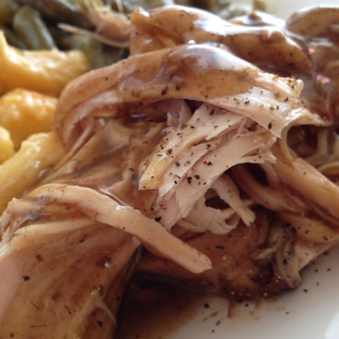 And the turkey? Well the entire roast is fully cooked, so that can be eaten cold or heated in the oven as well. However, as I mentioned above, we typically buy it individually packaged in smaller amounts. But what we love to do as well, is stock the HoneyBaked turkey roast as well. This roast is also pre-cooked and packaged with turkey gravy. So we set it in our crock pot on low before we leave for the day, and come home to just cook our sides.