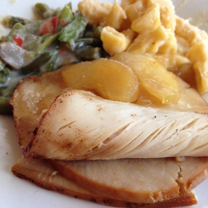 But how does it taste, you ask? Divine. The slow-roasted turkey breast is pre-sliced and tastes fresh, never old or “gamey”. Plus the slices are the perfect size for the left-over sandwich we all adore. The turkey roast will melt in your mouth, and can be easily sliced, or simply pulled apart by a fork for serving. This year we sampled the Green Bean Casserole {so good}, the Macaroni and Cheese {creamy-cheesy greatness}, as well as the Cinnamon Spiced Apples {OMG}. A meal in and of itself, I found myself glad I didn’t make mashed potatoes!