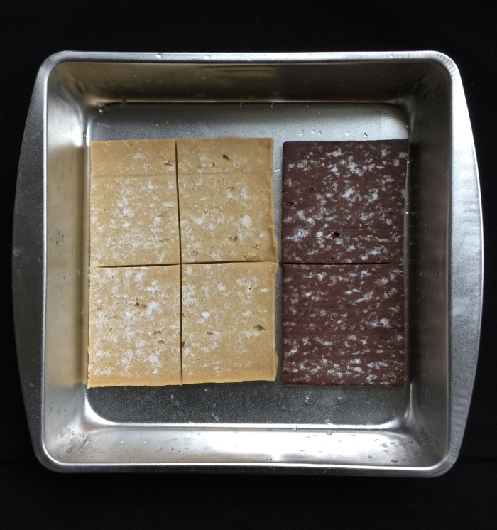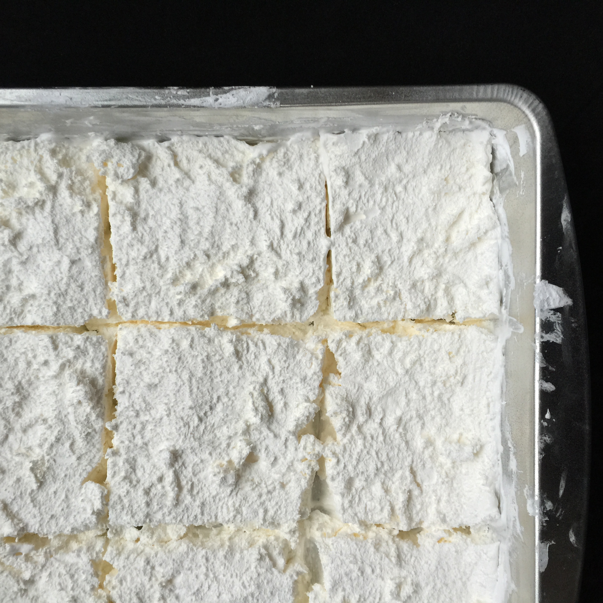 First, I bought a large tub of whipped cream and spooned the entire thing into a 9×9 square pan. I covered it with thin plastic wrap and placed it in the freezer overnight to solidify. The next day I took it out, and cleaned up the top that had stuck to the plastic.