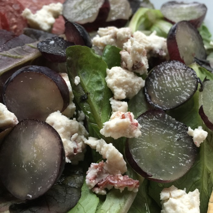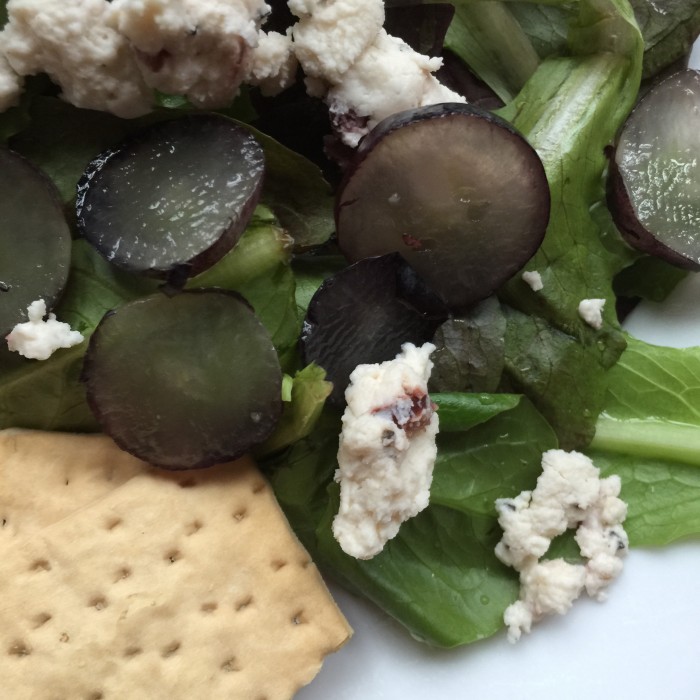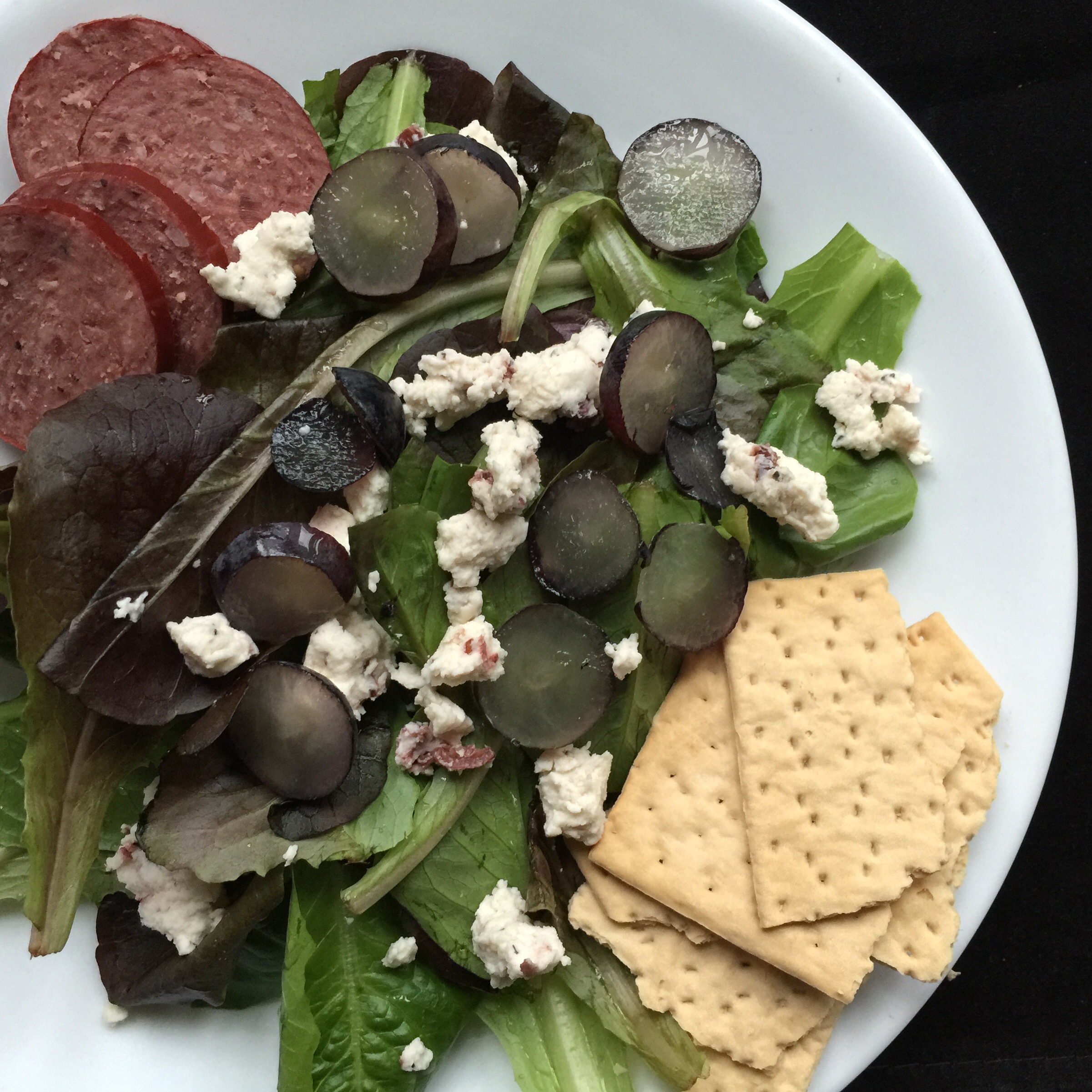 For instance, a plateful of baby romaine was the perfect base for this salad. I sliced the black grapes and crumbled my Boursin Cranberry Spice cheese atop. Then I sided it with my crackers {instead of croutons}. Opposite the crackers I stacked the beef summer sausage.