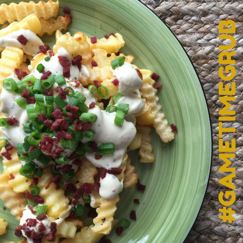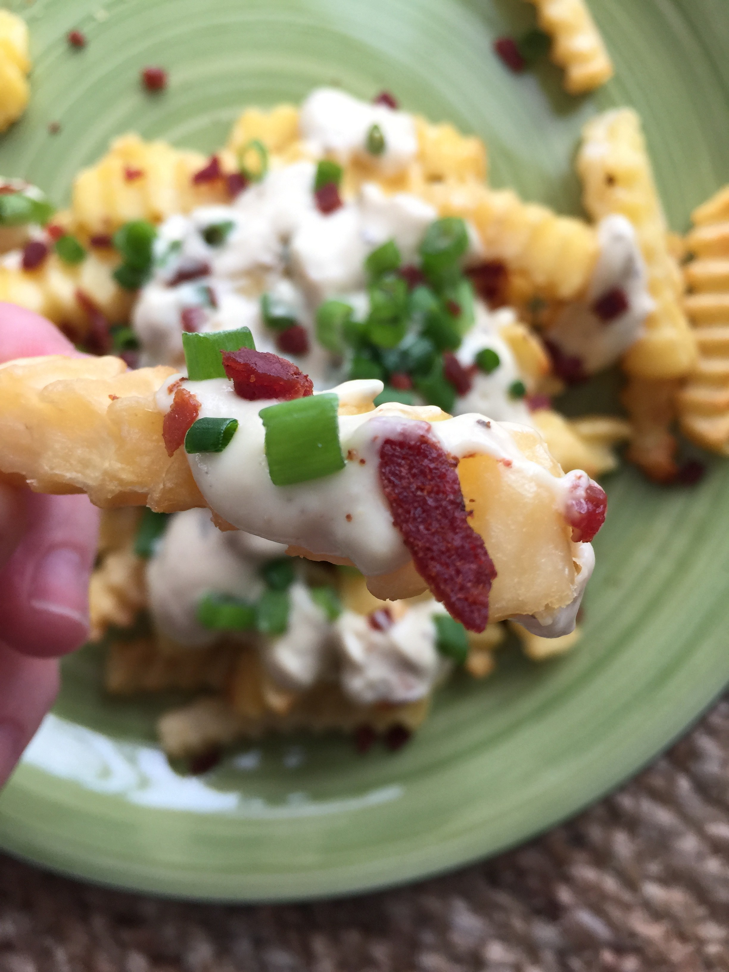 I baked the Alexia crinkle fries to crispy perfection and plated them. While steaming hot, drizzle this fantastic lemon-garlicky aioli dip over the french fries. Top with green onions and sprinkle with turkey bacon bits.