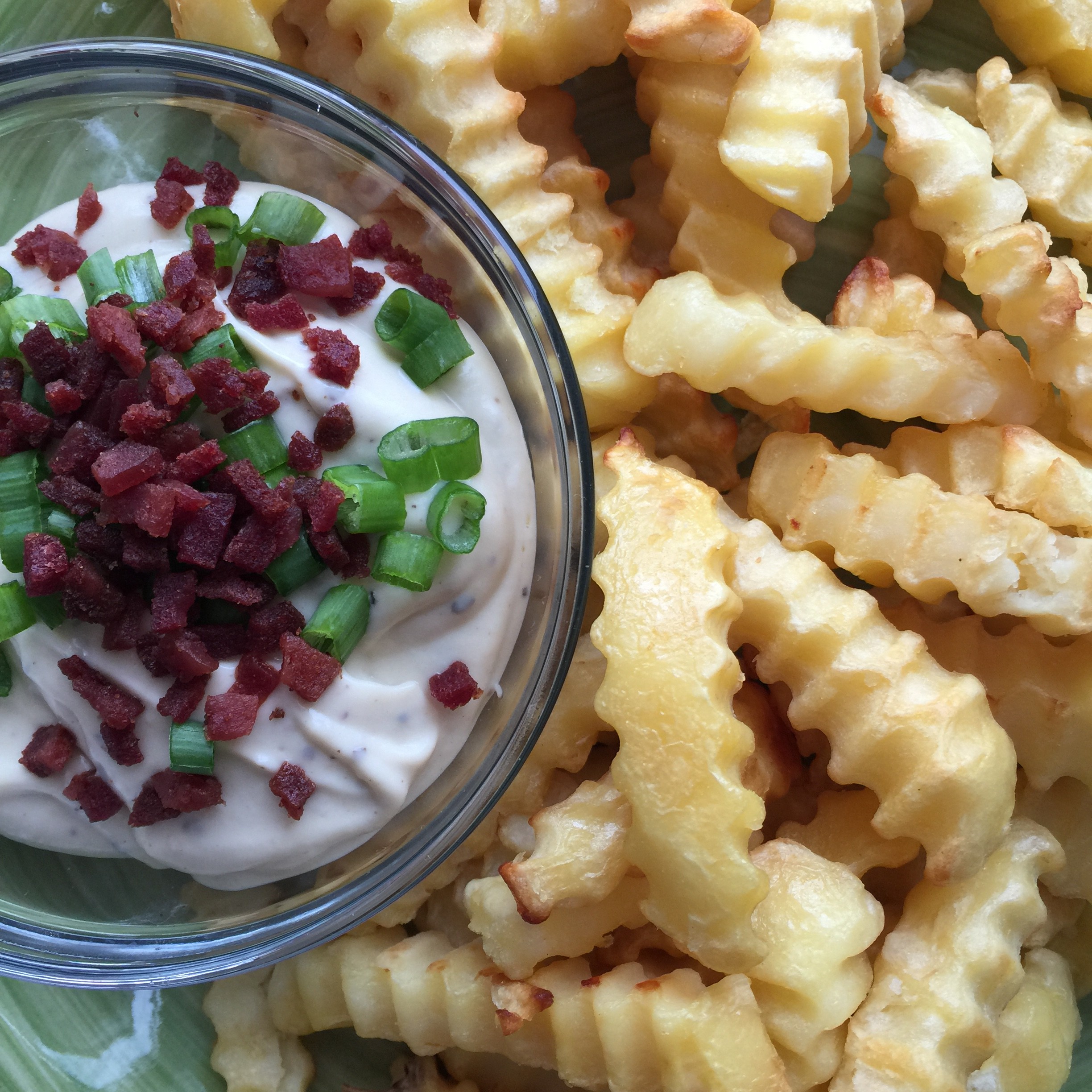 Another option for those that have kids like I do? Simply plate the Alexia crinkles with a bowl of the dip garnished with the green onions and turkey bacon. The reason I love this dip, is that it tastes really fresh. I’m able to indulge without feeling guilty afterwards.