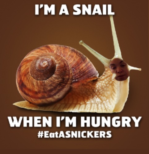 I am a snail too when I’m hungry! Good thing I can stock up on SNICKERS® to help me get things done! #client