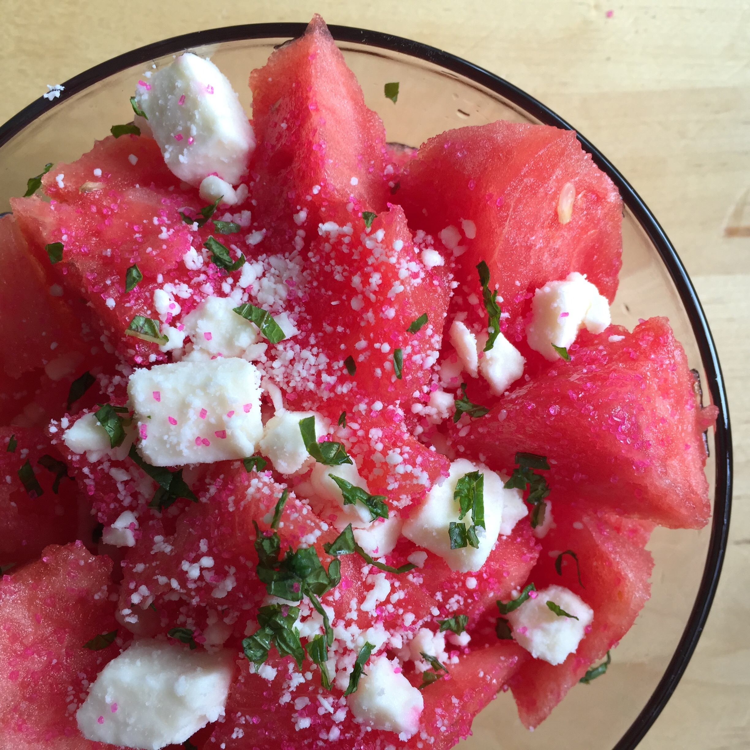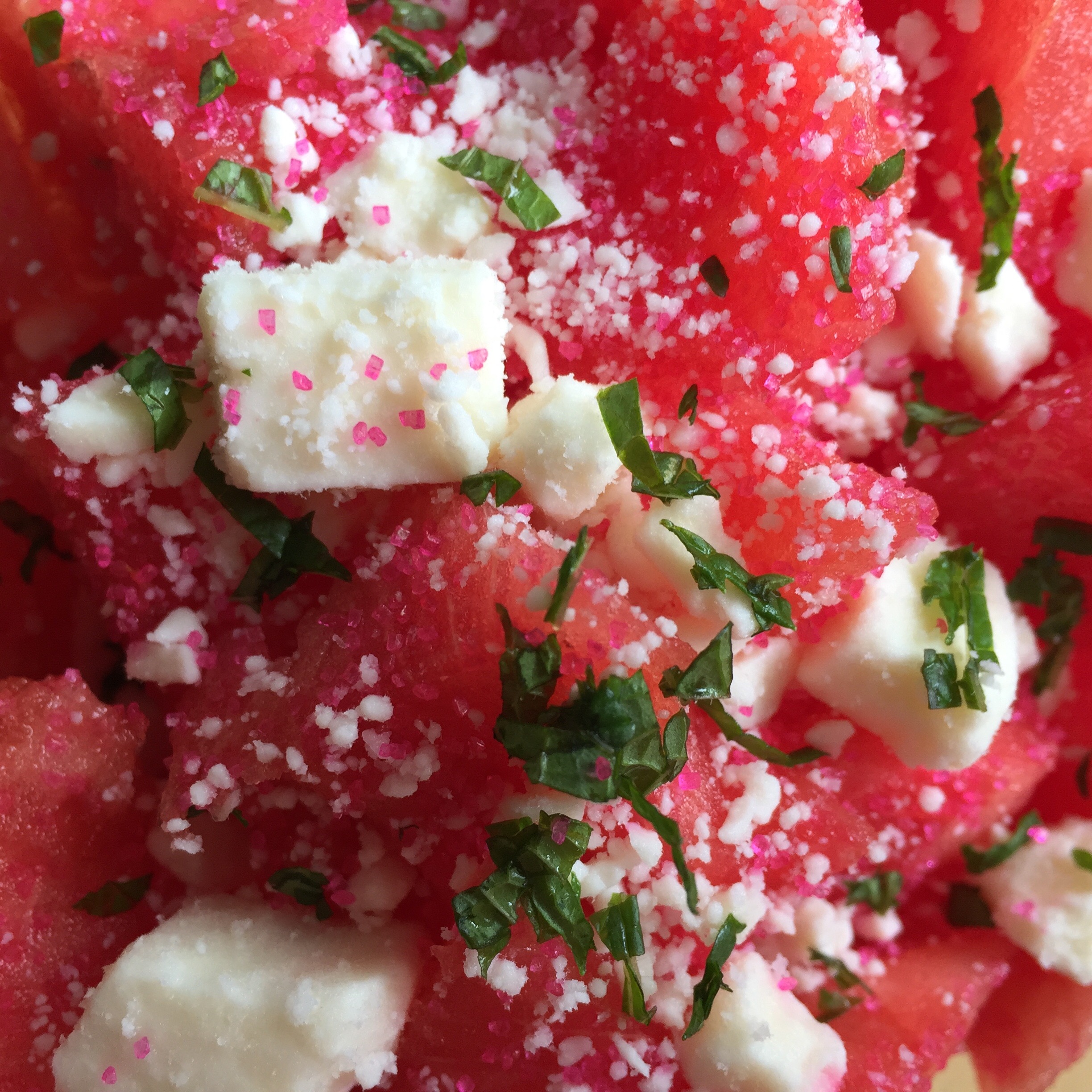 The sugar crystals were exactly the subtle sweet I was looking for. And they held a satisfying crunch. And when paired with this trio…they balanced the salty small crumbles of feta perfectly. Left on, they melt into the watermelon to mimic ripened perfection. Perfect for satisfying my sweet tooth without using copious amounts.