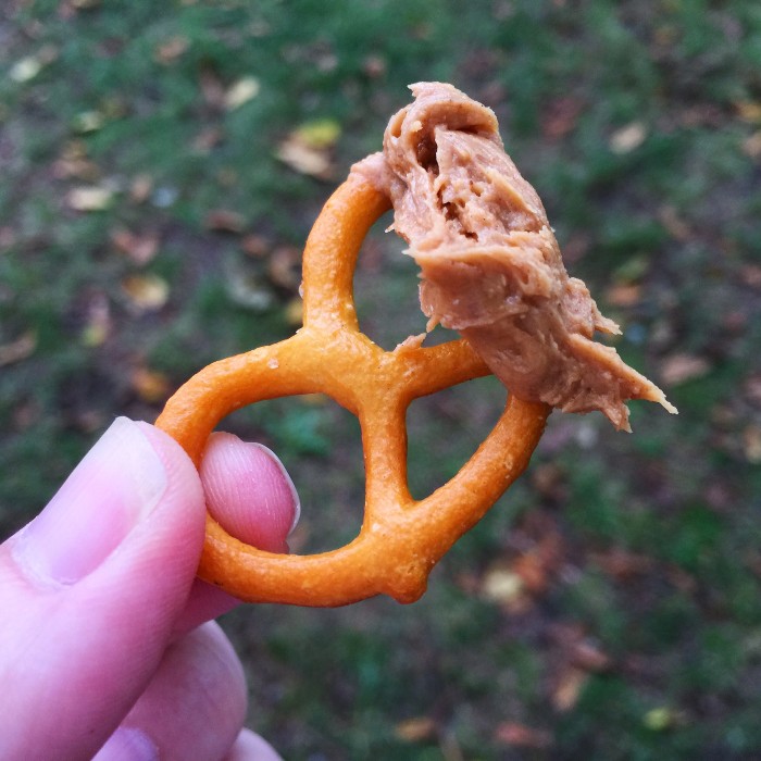 Yet this adventure came complete with a sack filled with peanut butter. Namely…the newest obsession in our pantry. The whipped peanut butter and salted caramel Jif Whips tub. Its a dipping dream I tell you. So also packed were crispy plantain chips, pretzels, and bananas. We were set now for our wooded yonder.
