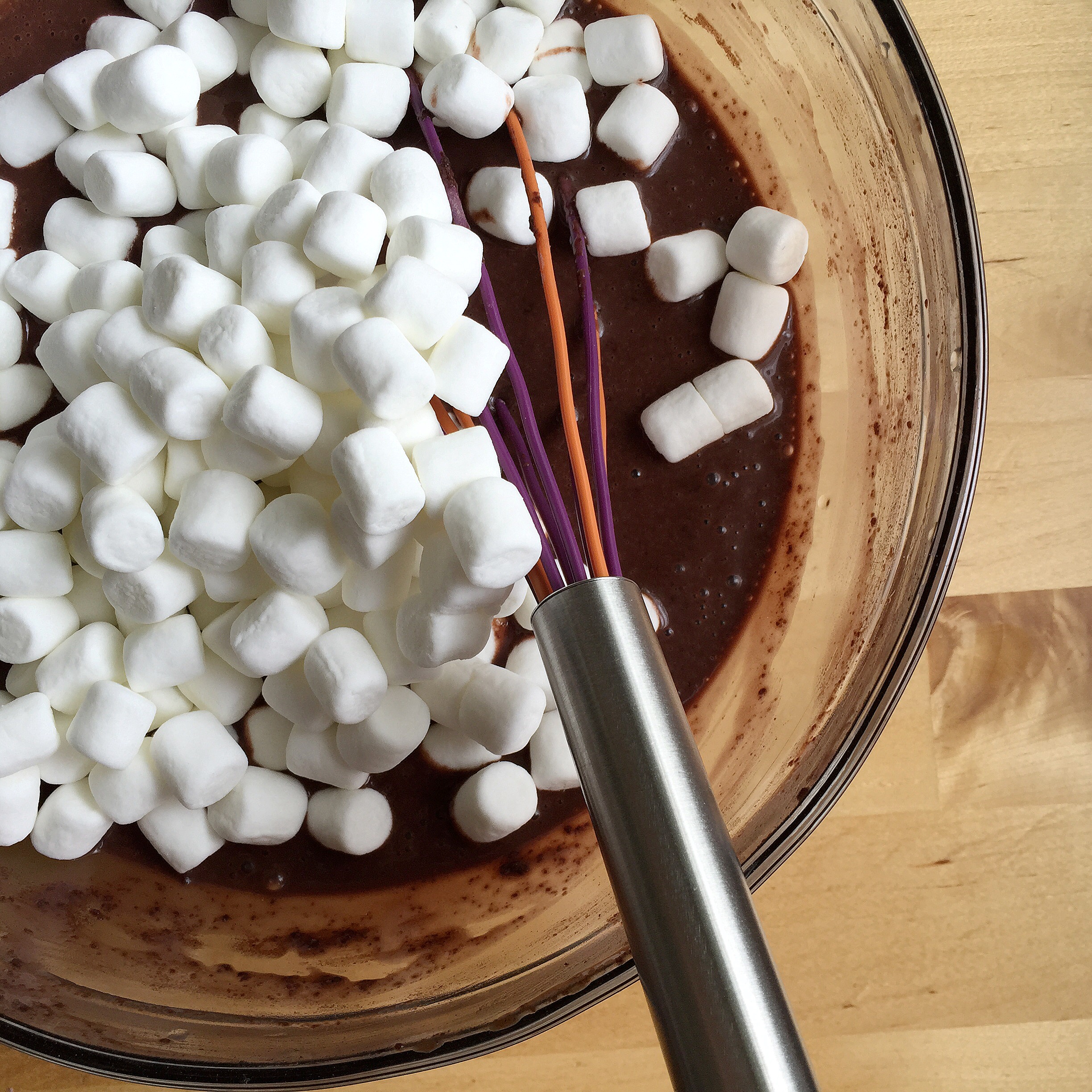 And in this case, I’m whisking 2 cups fairlife chocolate milk with a chocolate fudge pudding mix. Which folds right up with 1/2 a bag of mini marshmallows. After its been whisked and folded, pour this whole bowl into a pre-made graham cracker crust. I just love how simple and fun these pies are.