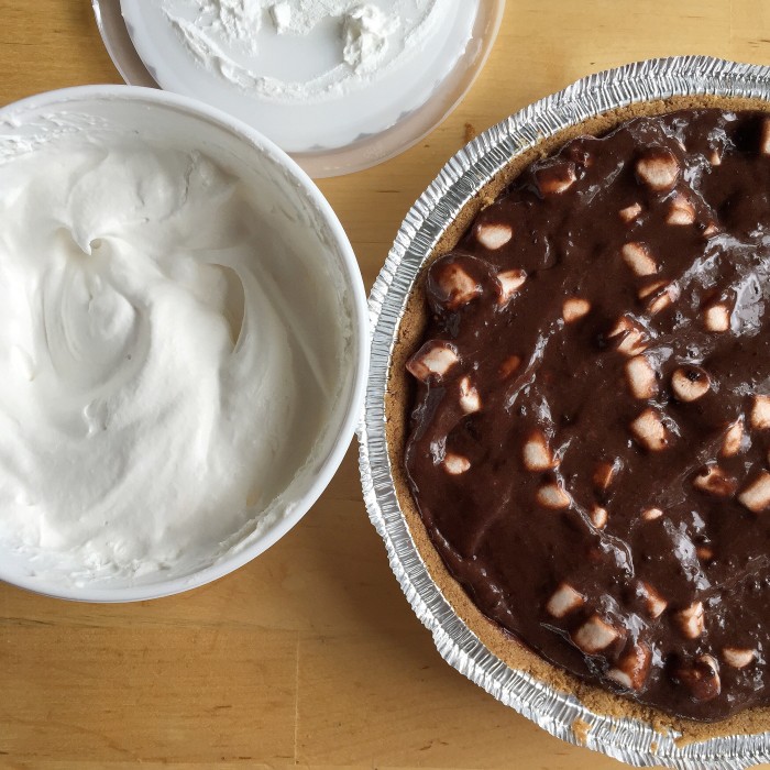 But we’re not done! You’ll need 1/2 a tub of whipped cream to top off this S’mores Pudding Pie. I even toss it in the freezer for 1/2 an hour to solidify up for easier serving.