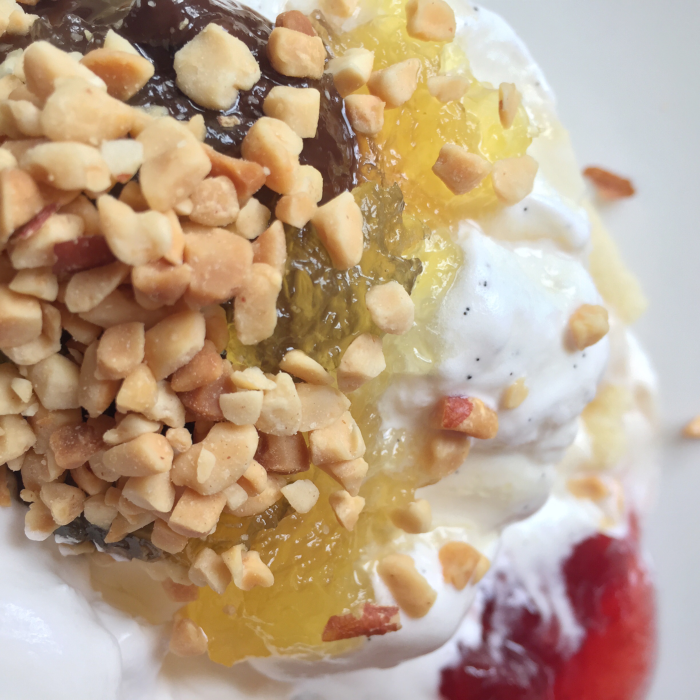 At this point, its a smorgasbord of tasty toppings being added. Of course we also have chopped peanuts to add. As well as whipped cream. And is it ever the perfect sundae without puddles of liquefied ice cream and toppings at the bottom?