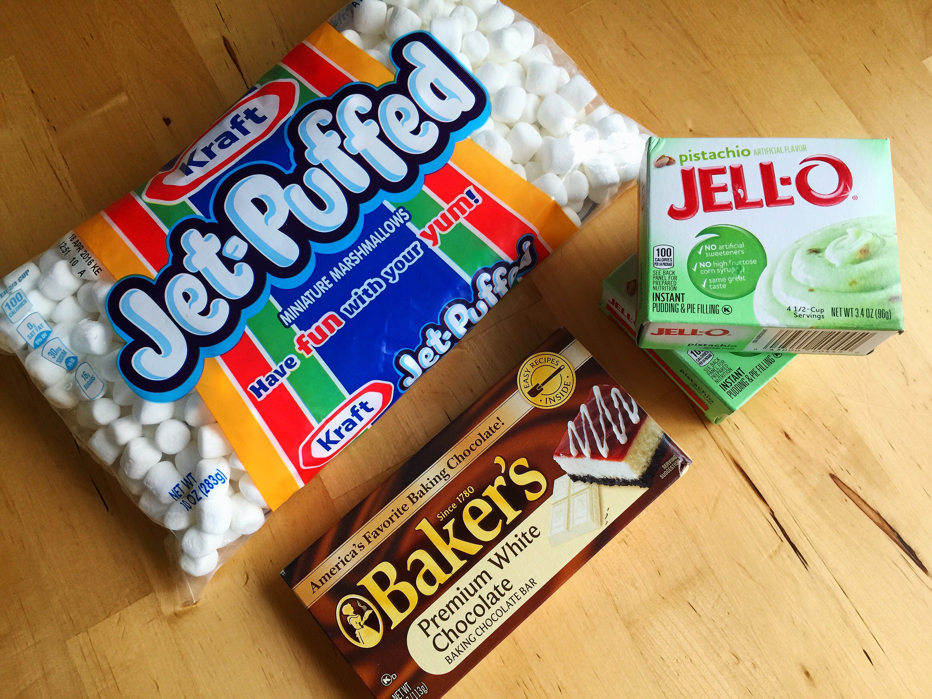 Once home, I took about five minutes to bring out all my ingredients. First out, the Kraft Jet-Puffed Miniature Marshmallows, two boxes of Jell-O Pistachio Pudding, and the Baker’s Premium White Chocolate.