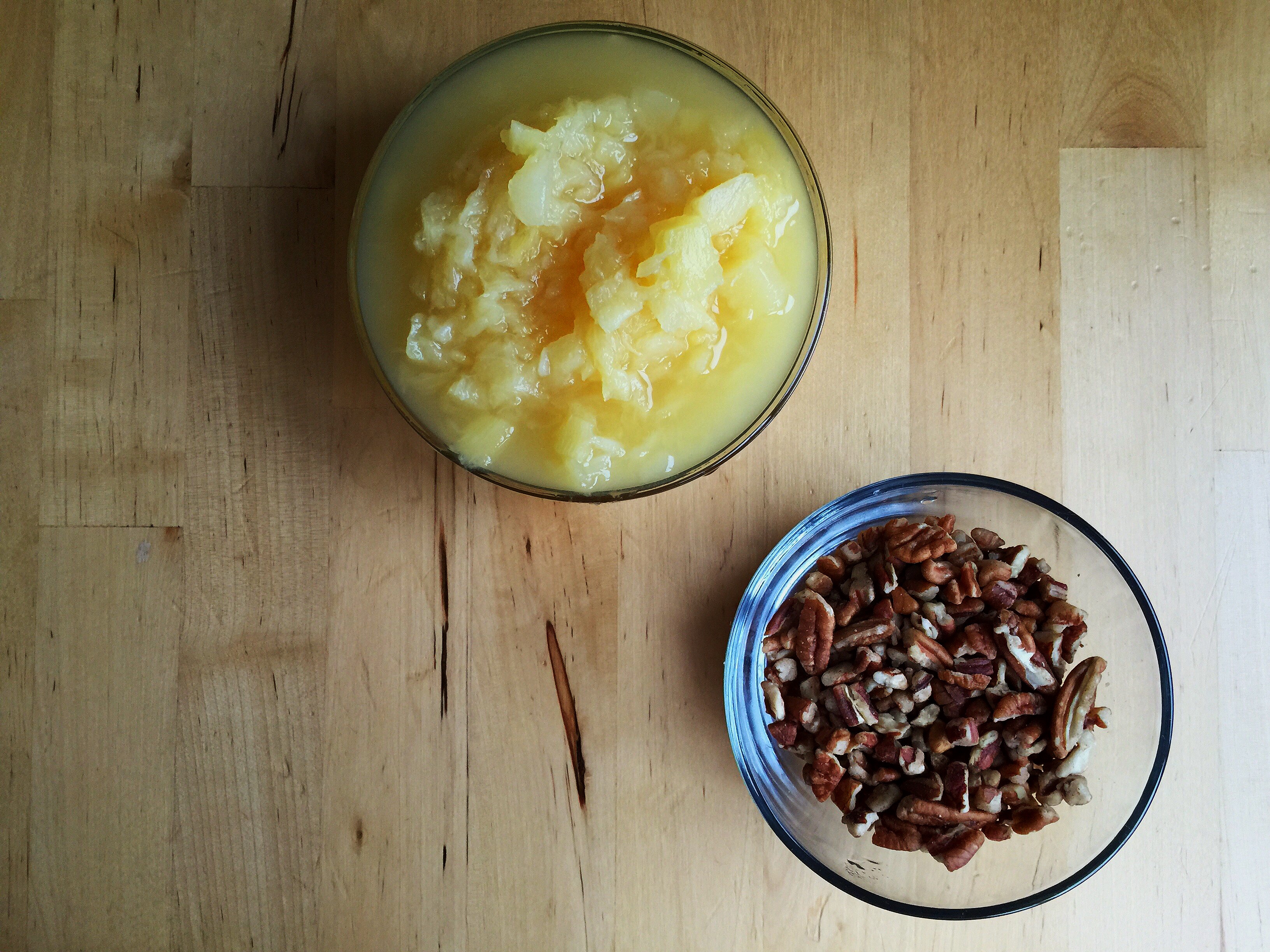 Next, I opened the can of crushed pineapple. Drain the juice and set aside. I also bought one small package of chopped pecans.