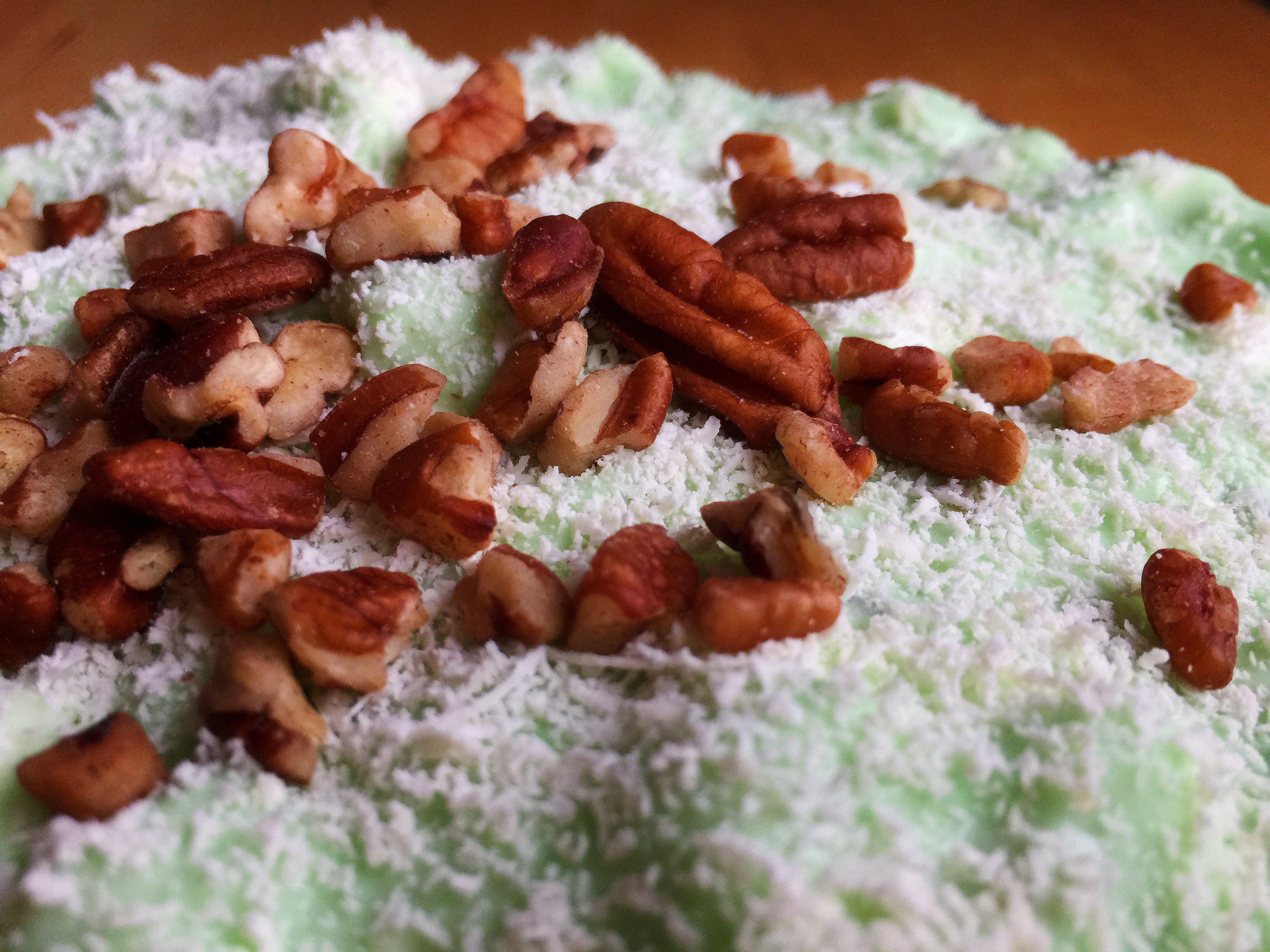 To which you now should be looking at this marvelous combined creation. Because after the white chocolate, you’ll garnish the middle of your Pistachio Fluff Pudding Pie with your chopped Pecans. And with that, you’re ready to toss this on the table!
