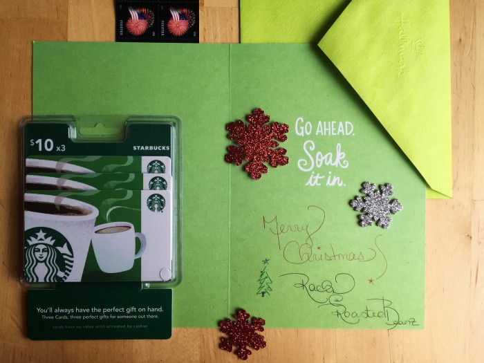 Next I hopped over to the Hallmark card aisle to find 3 holiday inspired greeting cards to hold money or gift cards {.97¢ ea}. To make the gift sweeter, there’s an at-shelf coupon for $2 off any 3-card Connections from Hallmark purchase. Talk about awesome savings! I also picked up a cute holiday card to explain my gift, and include my holiday wishes as well {$2.97}.