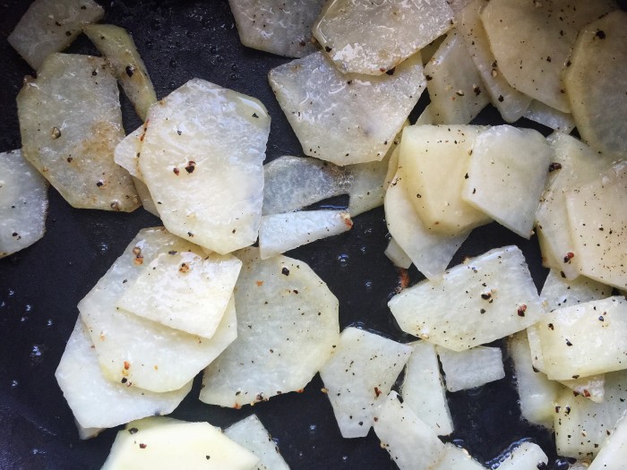 All it takes to get started is tossing 2 pats of butter into your frying pan. Then peel 1 medium sized russet potato. Rinse the potato and slice into thin strips over your pan. I grind in a few turns of salt & pepper. Then turn your heat on to a medium-low, cover with lid, and cook for 10 minutes.