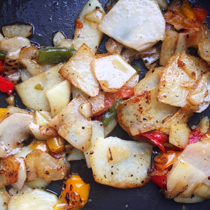 You’ll want to use a spatula to flip the potatoes occasionally, but after 10 minutes add your sweet peppers and onions. I use a frozen premixed bag. Trader Joe’s has a divine fire roasted sweet peppers and onions variety. And I’m all for making my mornings easier. However, 1/4 cup of fresh onions and sweet peppers would work just as well.