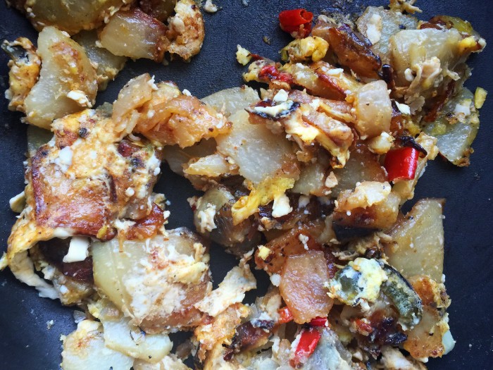 At this point, your potatoes should be lightly browning, and our veggies softening. To which you’re ready to crack in your egg. As you can see, sky is actually the limit on just how you prep your egg. However, I’ve always been partial to a good scrambled skillet variety.