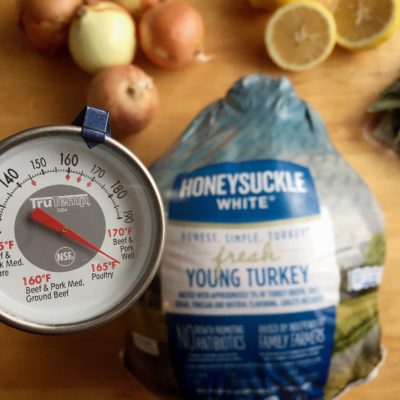 For instance, I literally picked up this bird from the Kroger meat department and had it in poaching in my stock pot hours later. Honeysuckle White even makes the turkey prep easier by including an oven-safe nylon brace** so you can easily truss your turkey! I start by giving the turkey a good rinse. And since I won’t be using them, I discard the included neck and giblet bag.