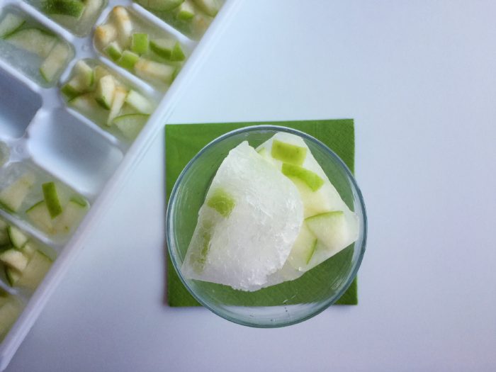 - Using one 12oz bottle (or can) of 7UP lemon lime soda, pour over apples to fill ice cube tray